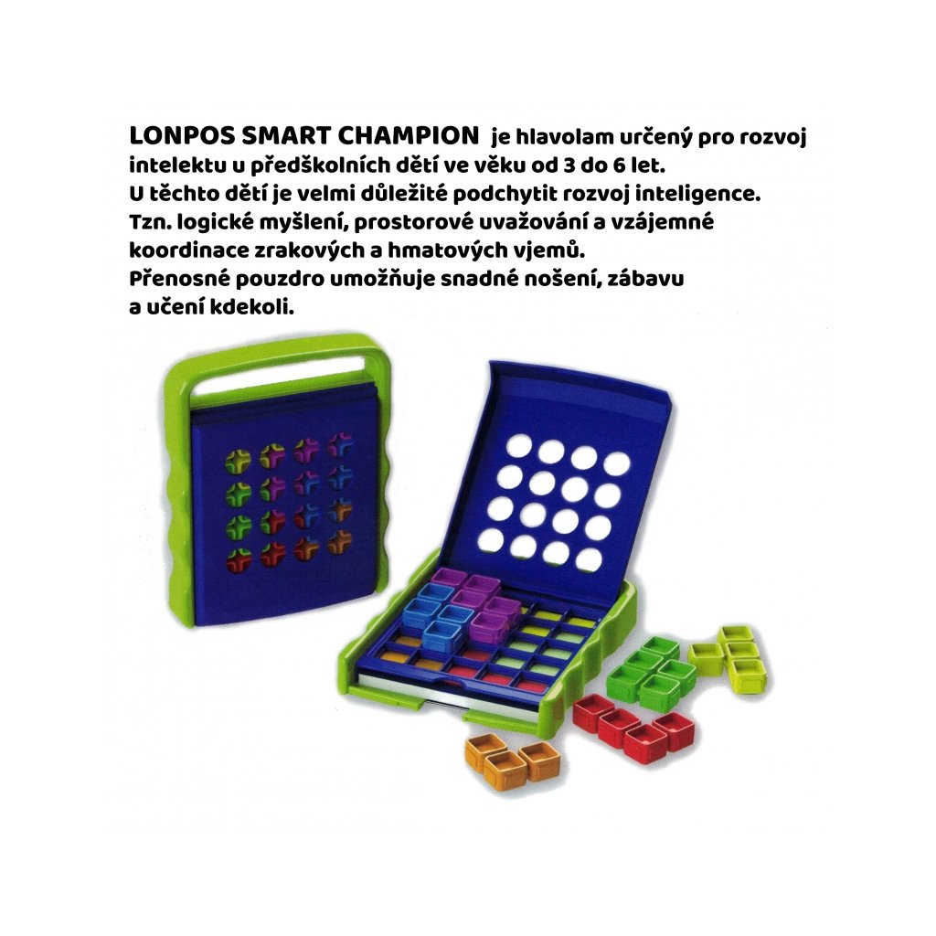 LONPOS SMART CHAMPION je hlavolam určený pro rozvoj intelektu u předškolních dětí ve věku od 3 do 6 let. U těchto dětí je velmi důležité podchytit rozvoj logického myšlení, prostorového uvažování a vzájemné koordinace zrakových a hmatových vjemů. Toto vše perfektně splňuje tento hlavolam. Je vstupní branou do světa skvělých hlavolamů Lonpos. Jedná se o naprostou novinku na našem trhu !