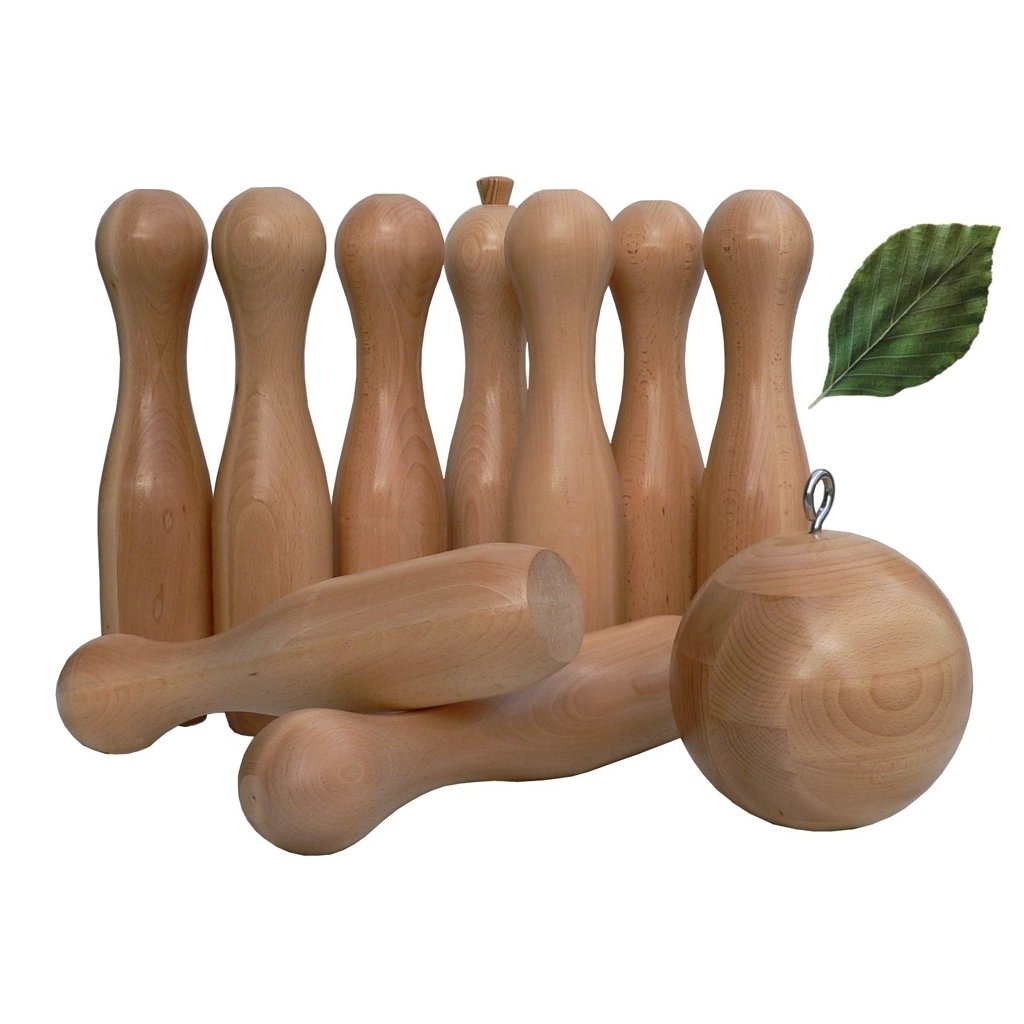 Kuželky i koule jsou vyrobené z buku, jsou baleny v papírové krabici o rozměrech 49 x 46 x 17 cm a o celkové váze 10,8 kg.